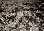 Flygfoto över stumholmen, badhuset + tillhörande flyghangaren, den långa byggnaden.