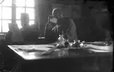 Arboga Tidning, personal och interiör. Fem personer på kontoret. Tre journalister arbetar vid sina skrivmaskiner. En person sitter vid skrivbordet och läser anteckningar. En man står upp och har ett långt papper i handen. På skrivborden syns telefoner, askfat och tidningar. På väggen, mellan fönstren, hänger bio- och teater affischer.