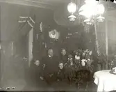 Enligt fotografens noteringar: "Cottillondekorerade folkdansare" Plats: Smårummen, Rådhussalen Datum: 20 Mars 1900 Tid: Kl 1.30 fm. Ljus: Blixtpatron Bländare: No 2 Objektiv: Svenska Express Exponering: momentan Framkallning: Hydrochinon, Eikonogén