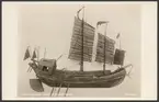 Reproduktion av rastertryck av teckning som framställer linjeskepp Göta Lejon. Teckningen är stark stiliserad och visar skeppet under segel i full fart. Under skeppet finns en banderol med text.