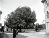 Mariestads Teater med "telefontornet" syns i bakgrunden. Affärsskyltar: Johanna Hieronymus & Co Tapisseri- Hvit- och Kortvaru- affär. Anna Hofgren Modehandel. A G Andersson Slagtare Olof Olsson Jernhandel