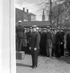 Skara. SKLS, veterinär Tufvesson avtackas av Sven Wennerstedt och slaktmästare Eliasson 1/6 1961. SKLS= Skaraborgs läns Slaktdjursförsäljnings Förening.