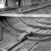 Skrivet på baksidan: Borden preliminärt hopfäst med varandra medelst påspikade klossar. När skrovskalet på så sätt blivit färdigt, lägger man in spanten och fäster dem med naglar till bordläggningen. Därefter slår man bort klossarna. Yawlbygge i Staveren, Friesland 1955. Fotograferat av: Ruksmuseum Zuiderseemuseum Enkhuizen, Holland Kop. finns D3:8