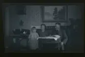 Fotografi på vardagsrummet med öppen spis, bord och stolar vid barnhemmet Lilla Källbäck, påsken 1962.