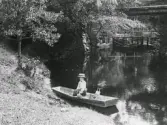 "Laxgård och hängbro i Uddaveka på 1920-talet." I förgrunden sitter en kvinna i stor hatt i en eka vid åstranden.