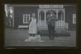 "Anna Åstrand, Robert Pettersson, Berg" En kvinna och en man och deras hund står framför ett hus.