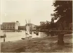 Fästningen. Fotografi från sekelskiftet över kanonbacken linje III, östra avslutningen som visar provskjutning med kanon mot mål i Vättern. Foto: Axel Sjöberg.