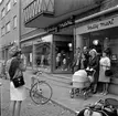 TVÅ KVINNOR MED VAR SIN HUND PÅ TRAPPAN TILL AFFÄREN.