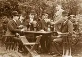 Segerstadsbor på födelsedagsfest hos Verner på Mossen Barnegården. Fr.v: 1. 2. Augustsson, banvakt 3. Karl Nilsson, Barnegården 4. Arvid Thräff, Barnegården 5. Torsten Persson, Barnegården 6. Verner Boström, Lille Backgården 7. Alfred Melin, Barnegården 8. Frans Johansson, Pinegården