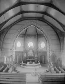 Interiörbild av koret i okänd kyrka. Altarring, altare, altartavla.