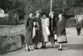 "Sömmerskorna" (arbetskamraterna) är på väg från bussen till "Petters" 40-årskalas på Gamlehagsvägen 17 i Torrekulla den 18 maj 1953. Bror "Petter" Pettersson firade sin 40-årsdag tillsammans med familjen och arbetskamraterna i hemmet. "Petter" arbetade som skräddare på Bergströms herrekipering i Göteborg. Relaterat motiv: 2023_0144.