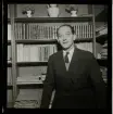 509 Hammenhög v för Allers. En man sittandes vid skrivmaskin. PÅ bokhyllan bakom honom står modellfartyg.