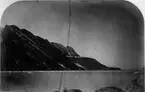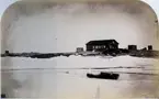 "Hela kolonien, längst t. venster ute på udden det röda observatoriet, t. höger och venster om huset det gula och blå observatoriet, längst t. höger termometerburen, taget fr. isen i Mosselbay, fr södra sidan d.23 Juni 1873. Axel Enwall"