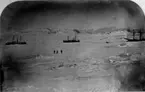 "Fartygen i vinterquarter i Mosselbay, folket sysselsatt med upptagande af de under stormen d.29 Jan. förlorade ankaren. d.6 April 1873 Axel Enwall."