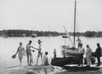Vykort, "Från Getterön, Varberg". Vy över 4:e vik åt sydöst mot fastlandet. Skrivarklippans fyr ses i bakgrunden. Vy över badande och solande med bryggan ut till Ståhlbrands brygga nedtill.