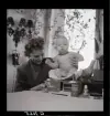 1708 E Mölnlycke väverier, Krokslätt. En kvinna står vid ett öppet fönster med ett litet barn i famnen.