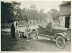 "Hur ska vi komma härifrån med vårt lyxåk?". C.F. Lidén med fästmö Margareta Bergstedt, vid bilen i en by, trol. någonstans i Sachsen.