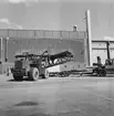 Folksamhusets gårdspark. Närmast en belysningsanordning formgiven av Arne Jones, längre bort skulpturen "Treklang" av samma konstnär.