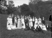 Gruppbild på brudpar med bröllopsgäster. Beställare: Hedström, Stockholm.