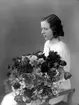Brudpar, bruden helt i vitt med lång slöja, myrtenkrans och brudbukett, brudgummen i bonjour och vita handskar. Elof Johansson