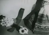 Kollage av accessoarer. Blommor. "De moderna blommorna för våren. Nejlikor i siden, krokus i buketter, hyacinter och bär. För både hattar och klänningar."