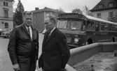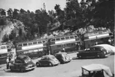Borås station mars 1960. Snabbussen Göteborg - Borås. Jönköping - Stockholm på stationsplanen. Insattes i trafik den 5 Juli 1953.
