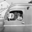 Man sitter i lastbil. Hilmer Persson, Bryggeriet, Hallstahammar. Ur Gustaf Åhmans samling.