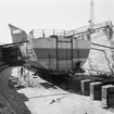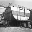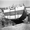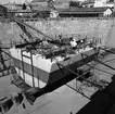 Vy över Beckholmen 1920-tal. Varvsbyggnader, arbetsbåt och dockor samt bogserbåt med pråmar på Saltsjön.