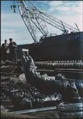 Vy över hur Vasa bryter vattenytan med hjälp av bärgningspontonerna Oden och Frigg.