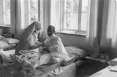 "Karantänsförläggning" på Kvarnbyskolan för flyktingar från koncentrationsläger i Tyskland 1945. Manlig flykting i sjuksäng och en sköterska.