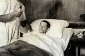 "Karantänsförläggning" på Kvarnbyskolan för flyktingar från koncentrationsläger i Tyskland 1945. En manlig flykting som ligger i en sjuksäng.