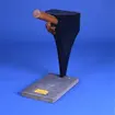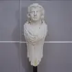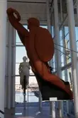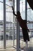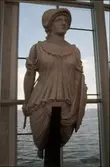 Detaljbild som visar galjonsfiguren av Linjeskepp Stockholm monterad på fartyget. Figuren framställer Erik den helige, Stockholm skyddshelgon. Foto är tagen underifrån och frontal framför skeppet förstäv.