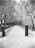 Vinter på Skansen. Parken vid Skogaholms herrgård. Putto på grindstolpe.