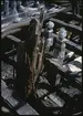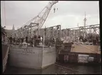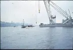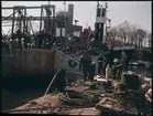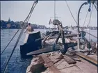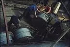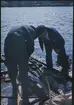 Arkeologerna Göran Bergengren (t.v.) och Jonas Ferenius (t.h.) rensar ett föremål från lera och slam med lätt vattenstråle, i Vasas hålskepp.
