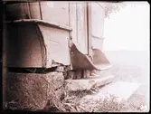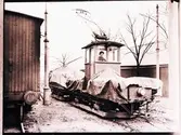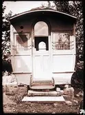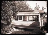 "Gammal hästspårvagn vid Frölunda smedja sommaren 1922. Sidovy" Vissa av vagnarna (smalspåriga häst-) användes, då de inte längre dög som transportmedel istället som sommarstugor, därav ombyggnaden vid trappan t ex. (Stig Hammarson 040827)