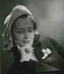 "Rose Valois, mellanbrun färg". Modell, möjligen Hjördis Grundel-Starenius, klädd i hatt. Hög kulle, utan brätte, fjäder, flor. Hatten bärs mitt på huvudet.