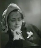 Hattmode visas på varuhuset Nordiska Kompaniet i Stockholm 1937. En ung kvinna poserar i halvprofil iförd en liten hatt med dekor av tygblommor. Hatten har ett knytband.