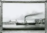 Foto i svartvitt visande hjulångfartyget "WERMDÖ" av Stockholm vid gamla packhuset, Gustafsbergs porslinsfabrik, Gustafsberg, omkring 1870-talet.