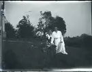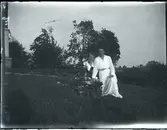 "Husmodersskolan". Två kvinnor sittande i trädgård vid Husmodersskolan.