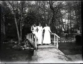 "Husmodersskolan". Tre kvinnor på träbro.