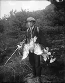 En man (jägare) med jaktvapen och en fågel i handen. Bostadshus i bakgrunden.