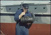 Kapten Carl Sandvis Wallin sittande på bryggan, foto av sonen Knut Wallin, enligt sonsonen Gunnar Wallin. Båten som hette "Pelle" och gick i många år som last och passagerarbåt på Ångermanälven. Han var skeppare på "Pelle" tills han var långt över 70 år.; Tror att båten sista åren gick som "kättingbåt" på älven. Det innebar att den lastades full med kätting och sen drogs av bogserbåt.