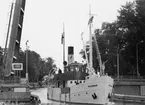 På bilden syns två sjömän som står vid relingen på jagaran Öland som ligger i slussen Brunsbüttel.