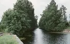 Den gamla bron över Tvååkers kanal. Fotot taget vid tomtgränsen till fotografens föräldrahem; fastigheten "Vilan", Fastarpsvägen 15. Hit körde familjerna med häst och vagn med stora bykekar och sköljde sin tvätt. De stod ute i vattnet med en bock och klappträ.