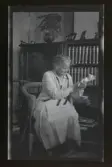 "Fröken Lindholm, Laggartorps skola." En kvinna sitter och håller en kattunge.