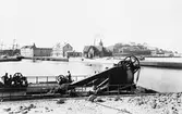 "Hamnparti". I förgrunden mudderverk. Vid kajen från vänster ligger hamnmagasin uppfört 1874, tullhuset från 1883 samt varmbadhuset uppfört 1866. I bakgrunden rester sig Varbergs fästning och längst till höger ses två kallbadhus! Det äldre längst till höger skadades i den höststorm 1884 och det nya närmare i bild stod klart 1886 och sedan revs det gamla. Fotograf Björsell var verksam inte verksam i Varberg efter 1885, vilket sätter den bortre tidsgränsen för detta foto.
