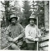 Per Larsas köla´, kolmila och kolarkoja. Från vänster: ej känd person, Per Larsson, Kvarnåsen, och Lars Ersson, Sörsidan.