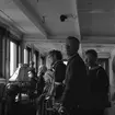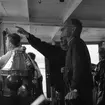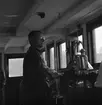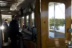 Här provar en finklädd dam från filmteamet tekniska instrument på bryggan.