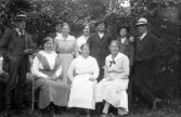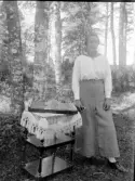 Alma Nelsson (född Eriksson) sitter i en trädgård i USA okänt årtal. Född 1881 på Ekan i Kållered, död 1959 i USA. Dotter till Karl och Alida Eriksson. Gift i USA med Carl Nelson. Paret fick sonen Robert Nelson.