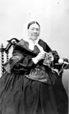 Porträtt av en okänd kvinna i rutig klänning som sitter på en stol.